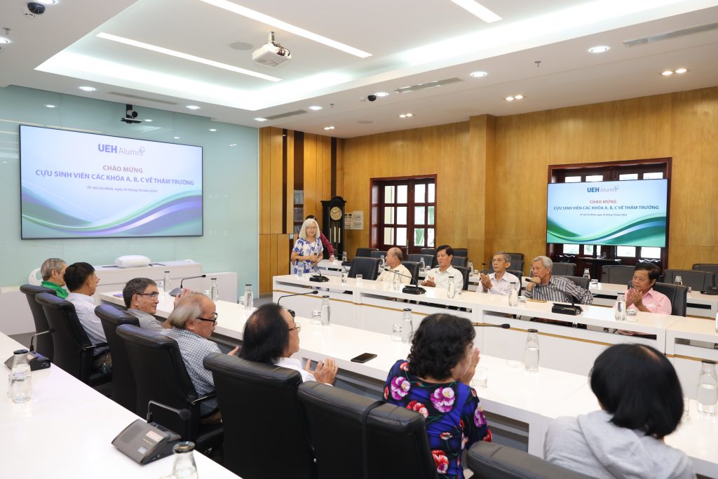 Sáng ngày 24/10/2022, tại phòng A.205, Ban Điều hành Mạng lưới cựu sinh viên UEH (UEH Alumni) đã đón tiếp Cựu sinh viên các khóa A, B, C về thăm trường nhân kỷ niệm 46 năm thành lập Đại học Kinh tế TP. Hồ Chí Minh (UEH) (27/10/1976 - 27/10/2022) trong không khí ấm áp, nghĩa tình.