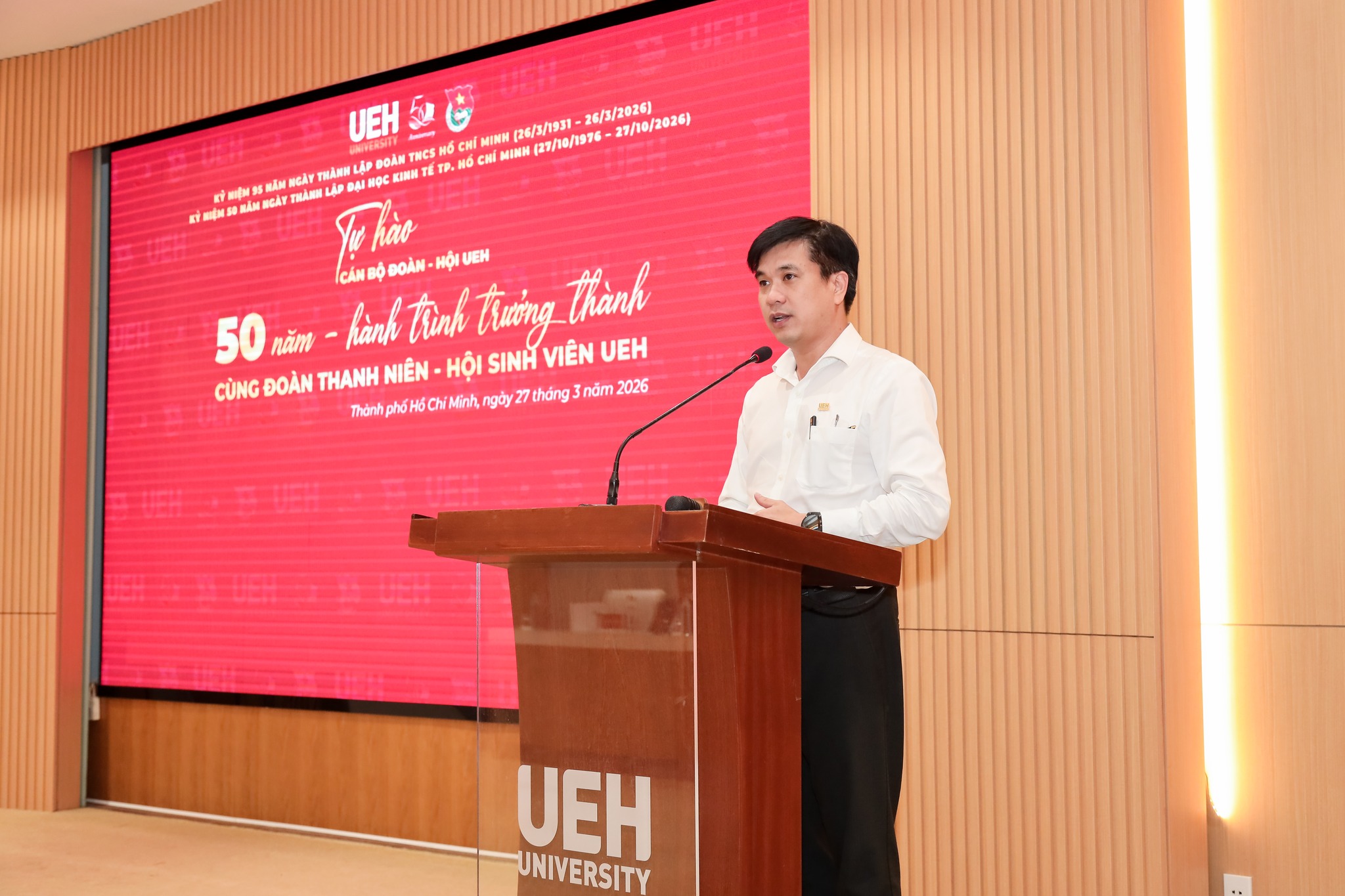 Chương trình họp mặt diễn ra trong không khí hân hoan, ấm áp và tràn đầy niềm vui. Đây là dịp để các thế hệ Cán bộ Đoàn - Hội UEH cùng gặp gỡ, ôn lại những kỷ niệm đẹp, sẻ chia những câu chuyện của một thời thanh xuân sôi nổi, qua đó tiếp tục bồi đắp tinh thần gắn kết và góp phần xây dựng cộng đồng Cựu Cán bộ Đoàn - Hội UEH ngày càng phát triển vững mạnh. Mở đầu chương trình, PGS.TS. Bùi Quang Hùng đã phát biểu chúc mừng tập thể Đoàn Thanh niên UEH cùng các thế hệ Cựu Cán bộ Đoàn - Hội UEH nhân dịp kỷ niệm 95 năm Ngày thành lập Đoàn TNCS Hồ Chí Minh, đồng thời nhấn mạnh niềm tự hào về hành trình 50 năm trưởng thành, phát triển của tuổi trẻ UEH cùng Đoàn Thanh niên - Hội Sinh viên UEH.