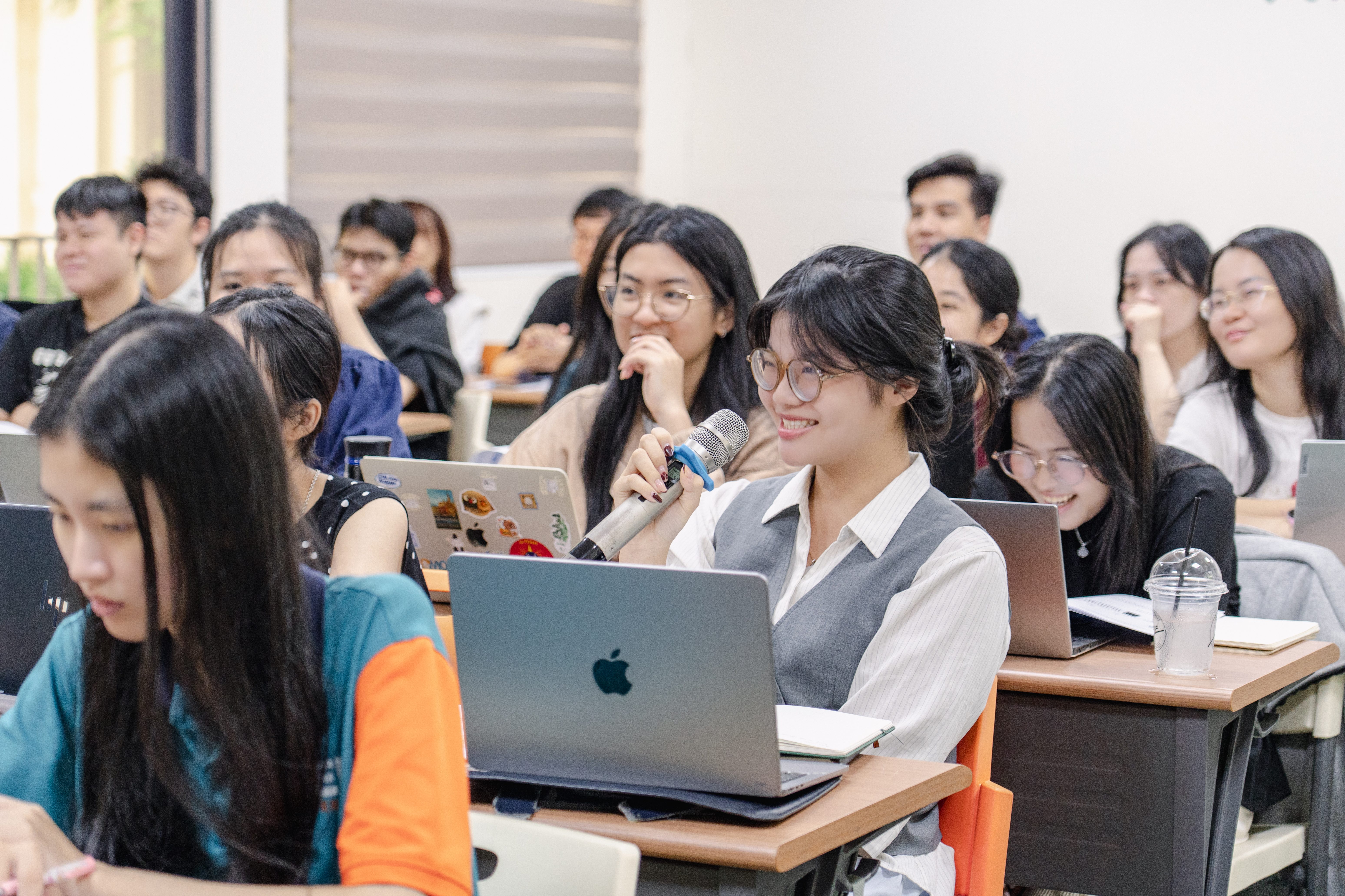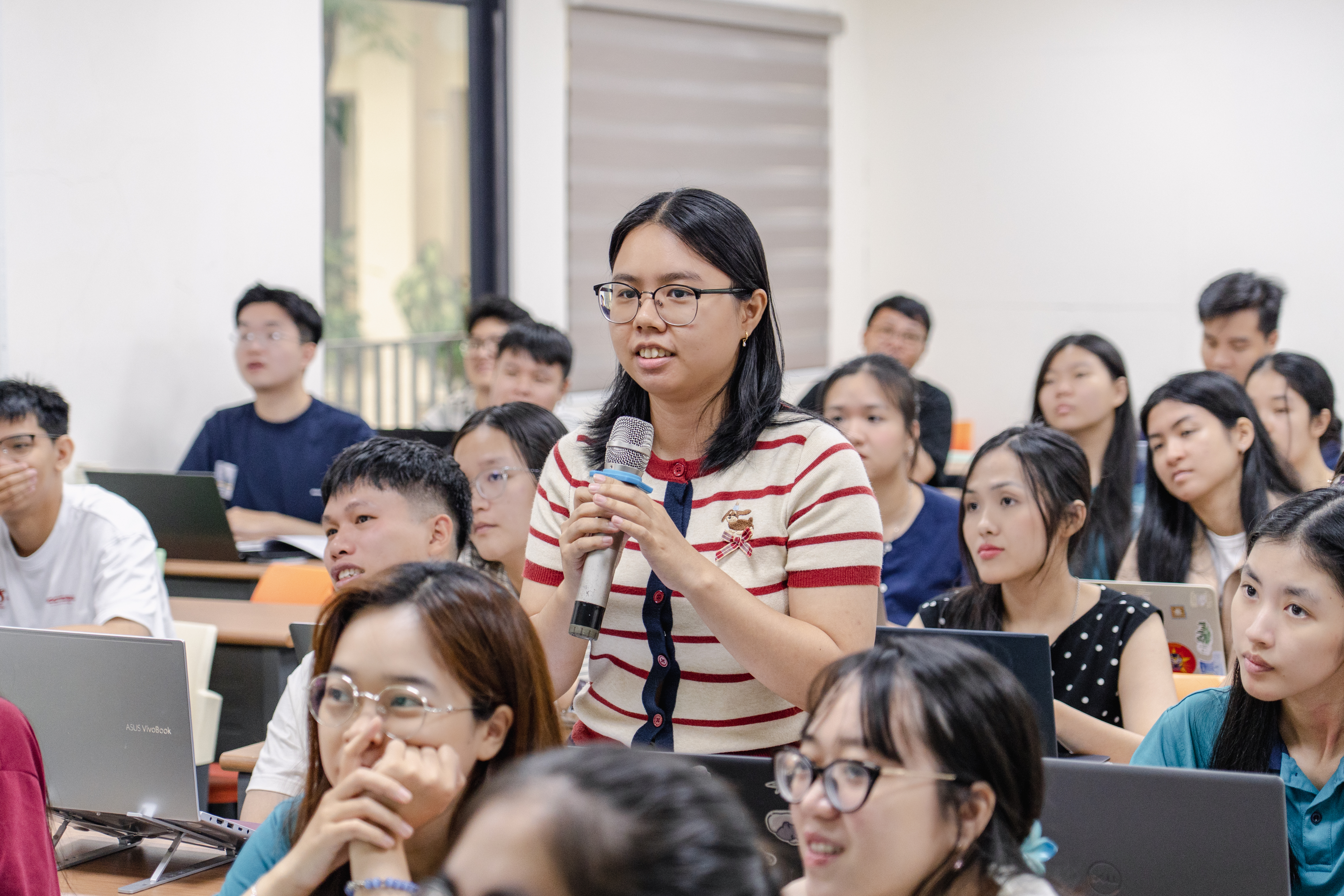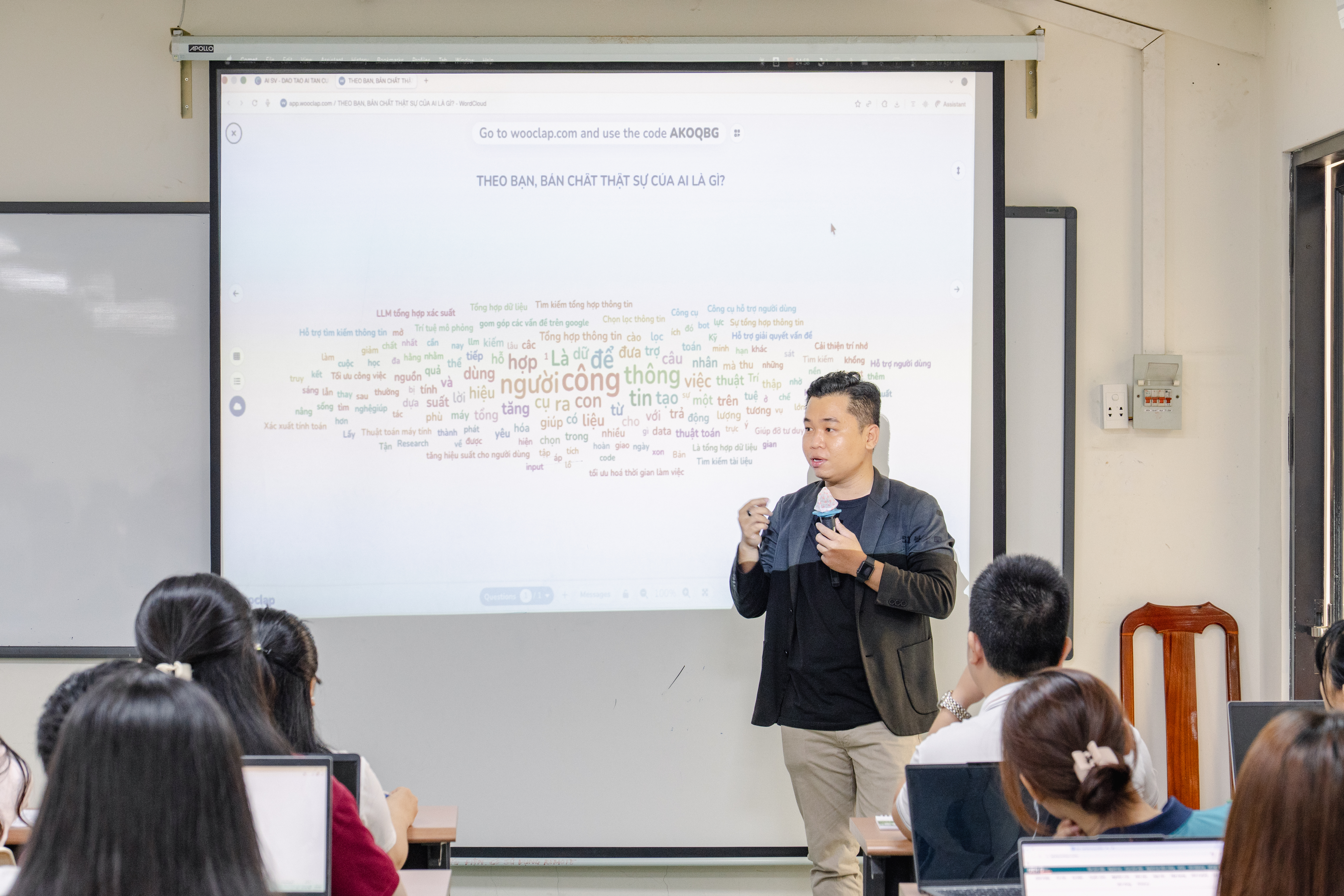 Bên cạnh phần chia sẻ, các tân cử nhân còn chủ động thảo luận, chia sẻ góc nhìn và kinh nghiệm sử dụng AI của bản thân ngay tại lớp học. Sự tương tác hai chiều này góp phần tạo nên một môi trường học tập cởi mở, nơi mỗi người đều có thể đóng góp, học hỏi và từng bước hoàn thiện hiểu biết của mình về công nghệ AI