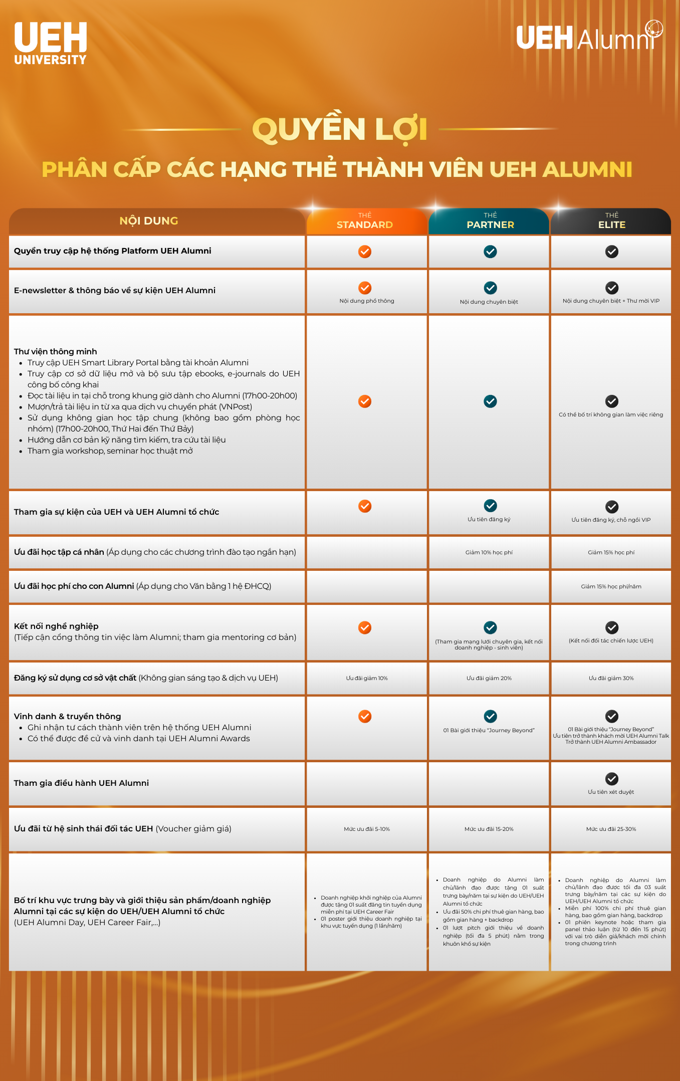 UEH Alumni E-Member Card được triển khai với 03 hạng thẻ, tương ứng với mức độ gắn kết và đồng hành của Cựu sinh viên cùng UEH Alumni. Mỗi hạng thẻ mang đến những quyền lợi và trải nghiệm riêng biệt.
