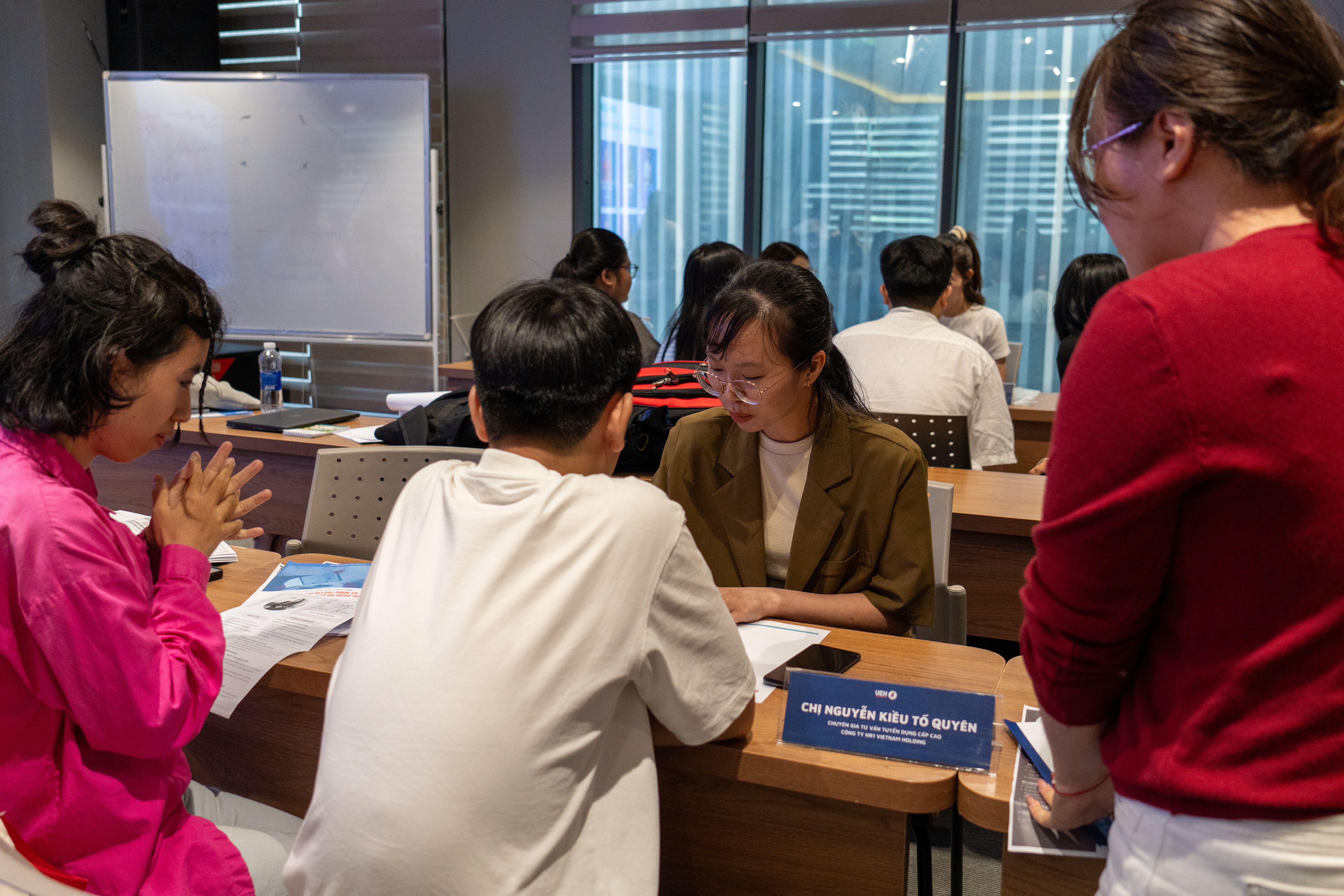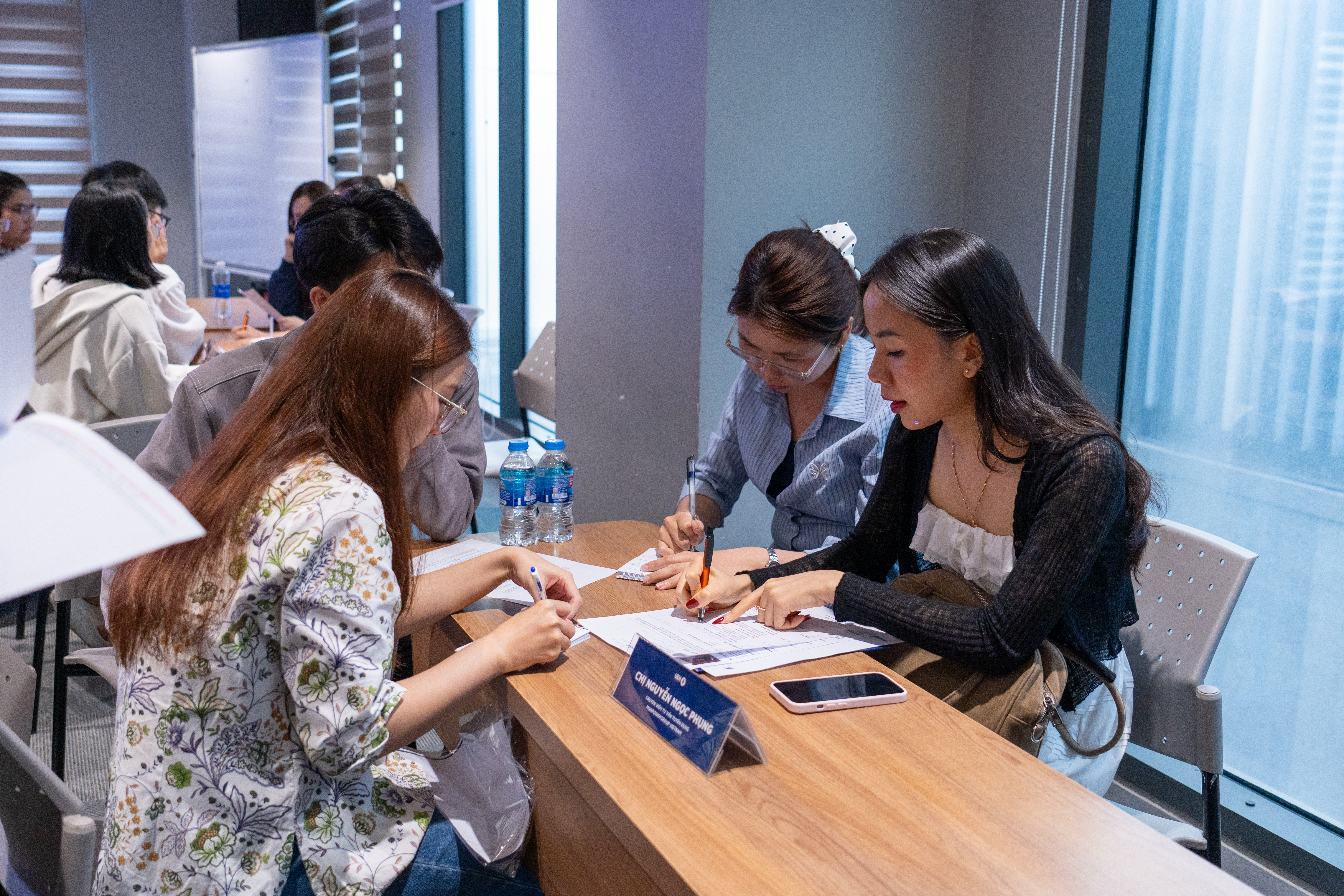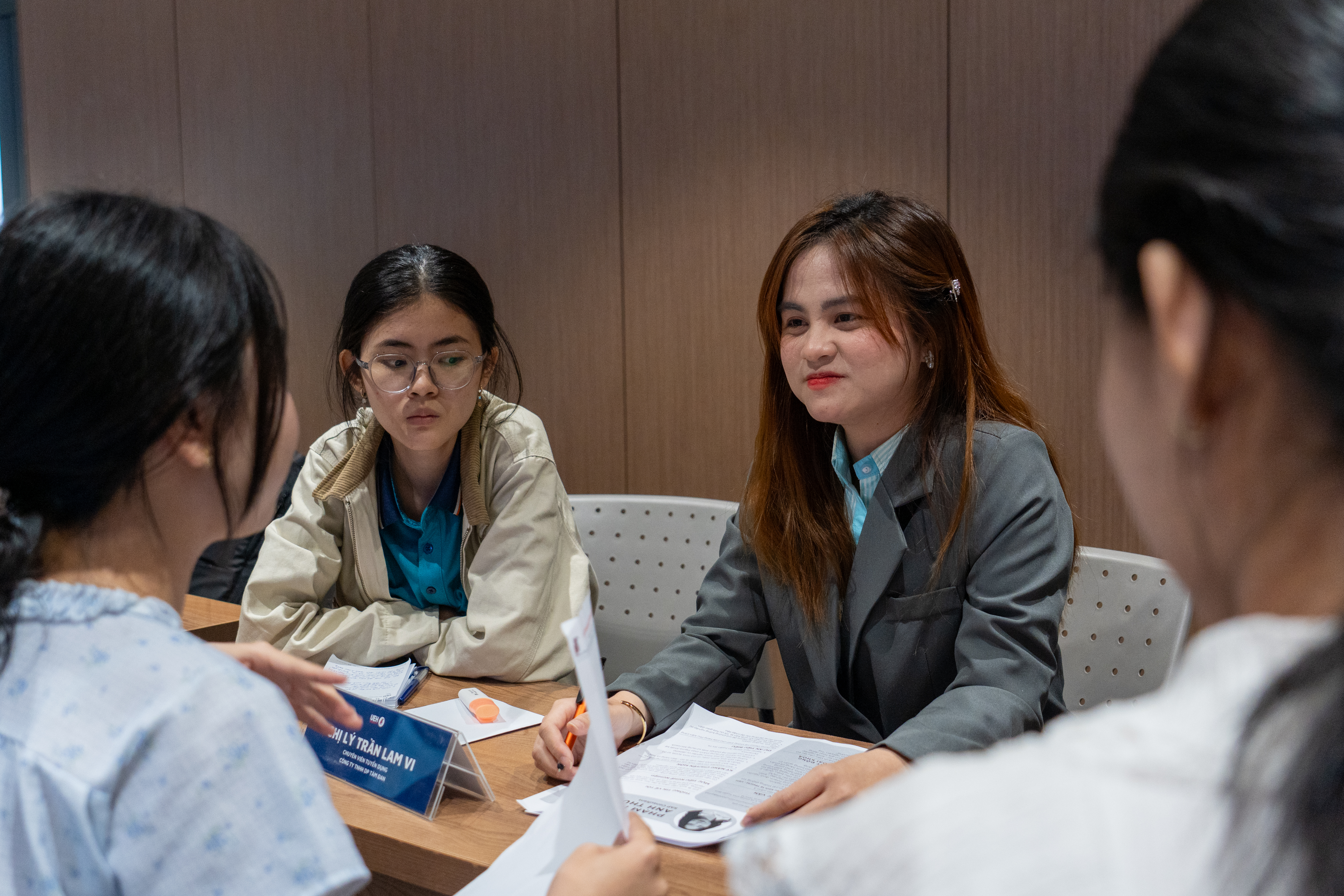 Bên cạnh phần chia sẻ, các bạn tân cử nhân còn trực tiếp tham gia hoạt động phỏng vấn mô phỏng và nhận phản hồi từ đội ngũ chuyên gia tuyển dụng, bao gồm: