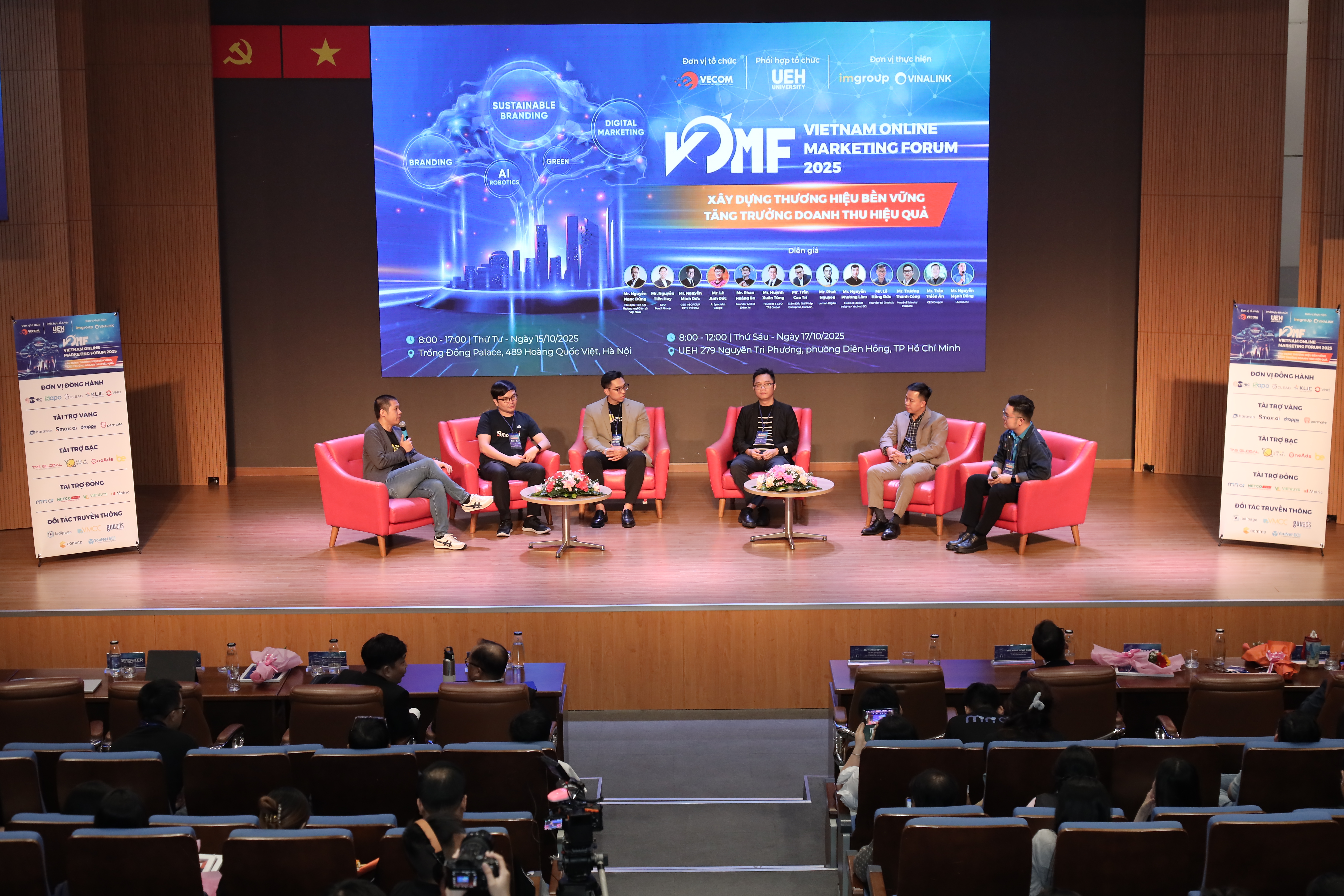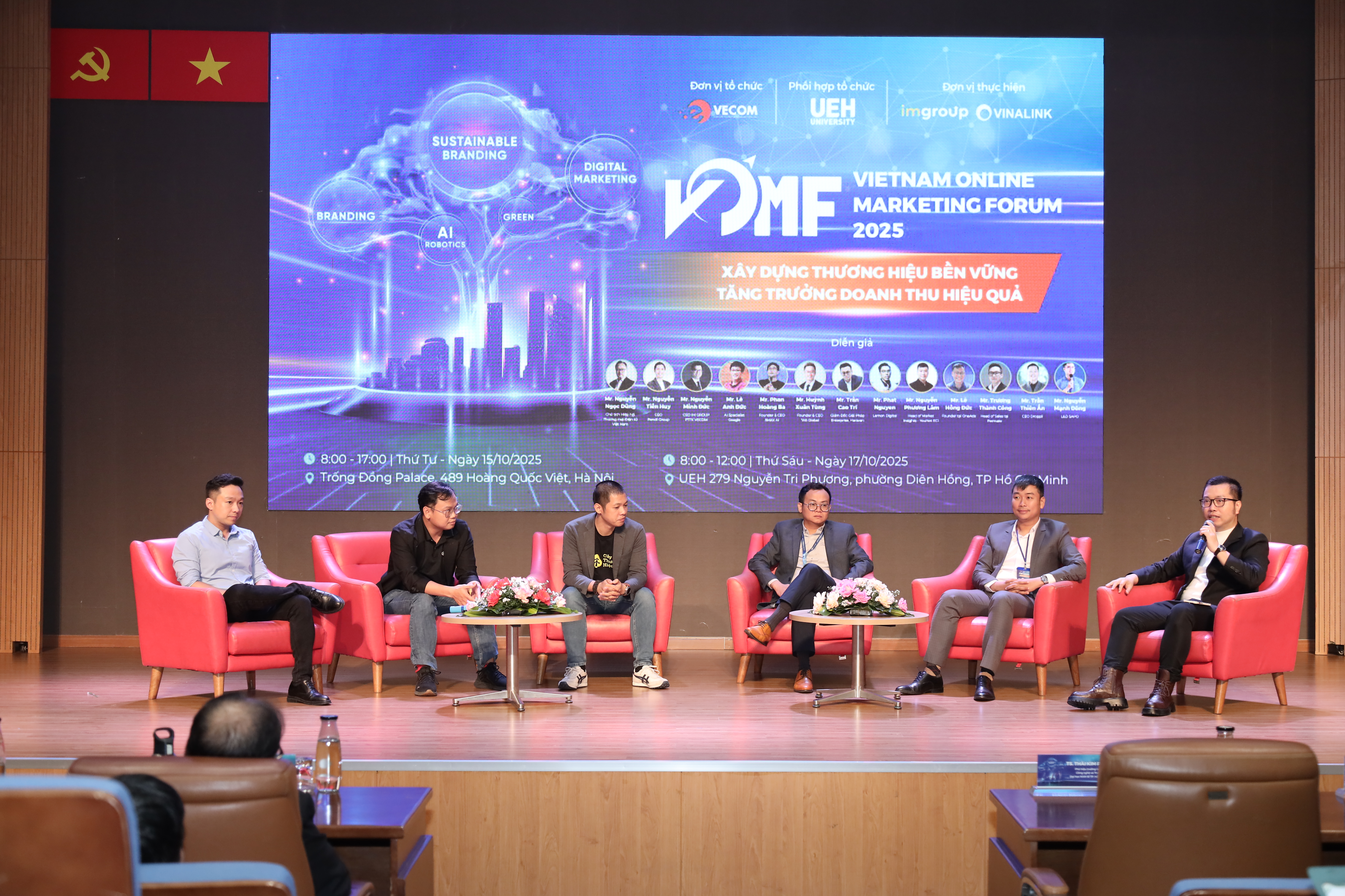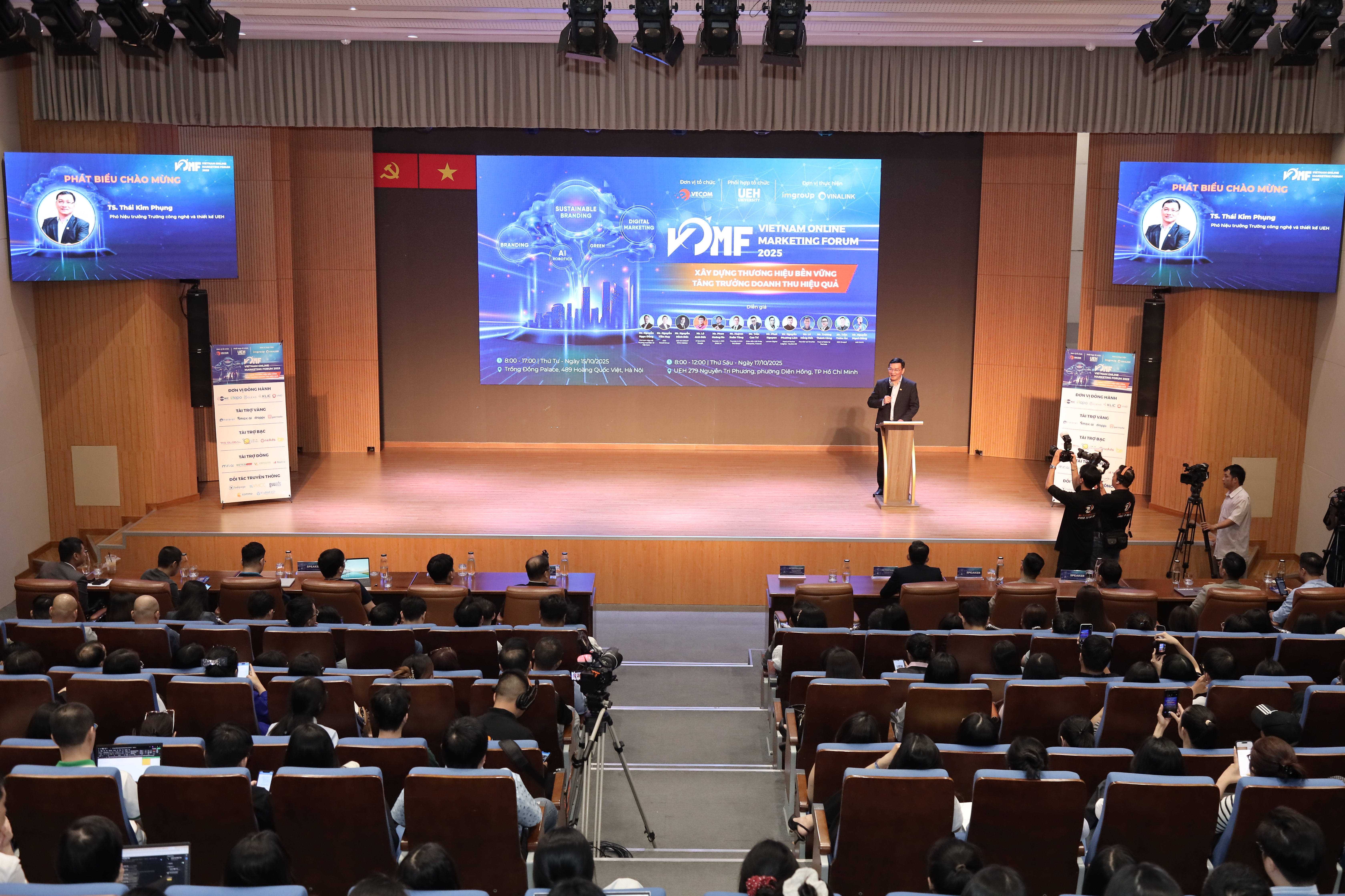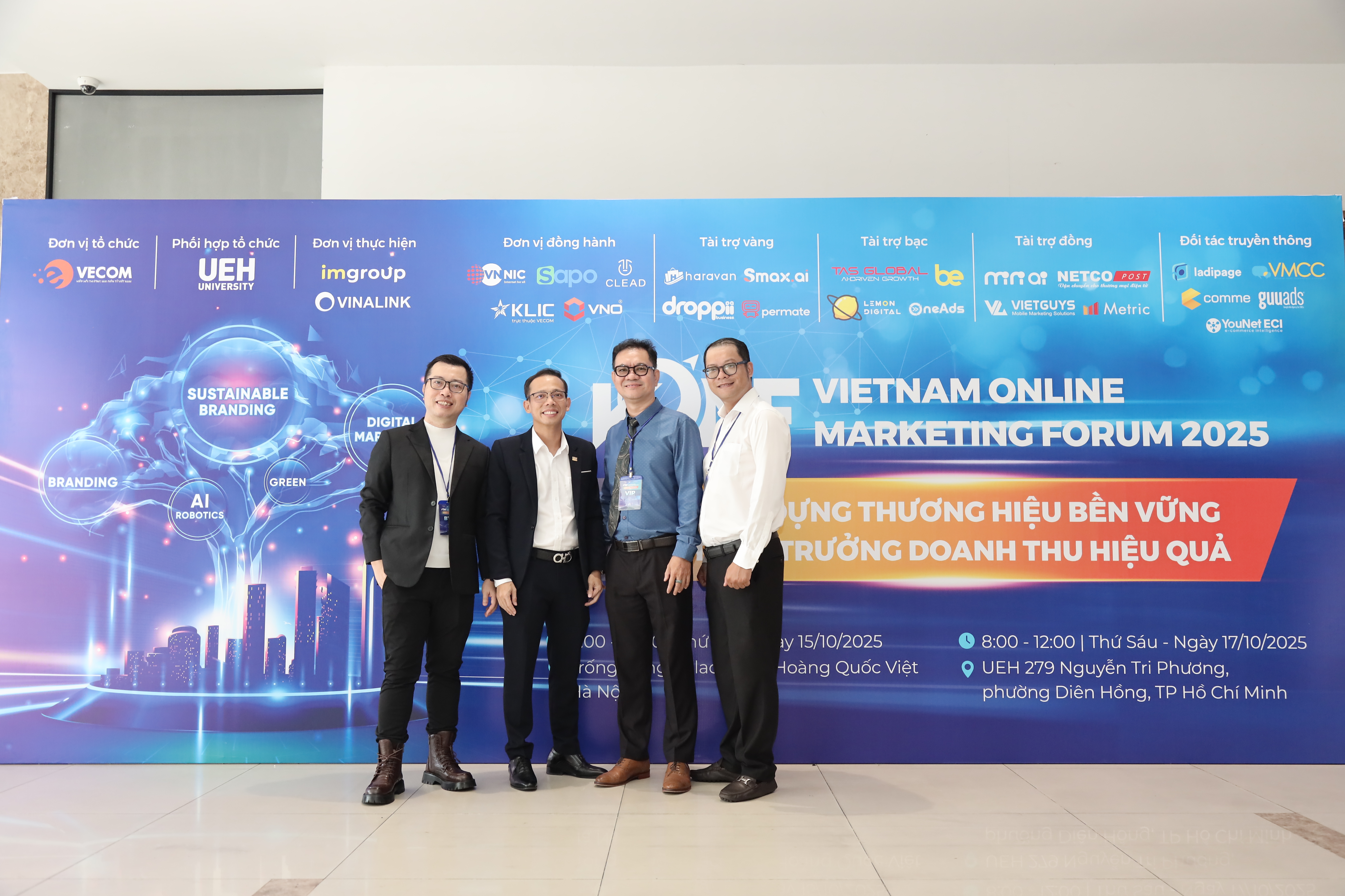 Trong khuôn khổ chương trình “Kết nối cộng đồng - Lan tỏa tri thức - Hành động bền vững”, sáng ngày 17/10/2025, tại Hội trường B1.302, Đại học Kinh tế Thành phố Hồ Chí Minh (UEH) phối hợp cùng Hiệp hội Thương mại điện tử Việt Nam (VECOM) và Mạng lưới các cơ sở đào tạo Thương mại điện tử tổ chức thành công Diễn đàn Tiếp thị Trực tuyến - Vietnam Online Marketing Forum 2025 (VOMF 2025) với chủ đề “Xây dựng thương hiệu bền vững - Tăng trưởng doanh thu hiệu quả”. Chương trình đã thu hút sự tham gia đồng hành của nhiều doanh nghiệp lớn trong lĩnh vực tiếp thị và thương mại điện tử.