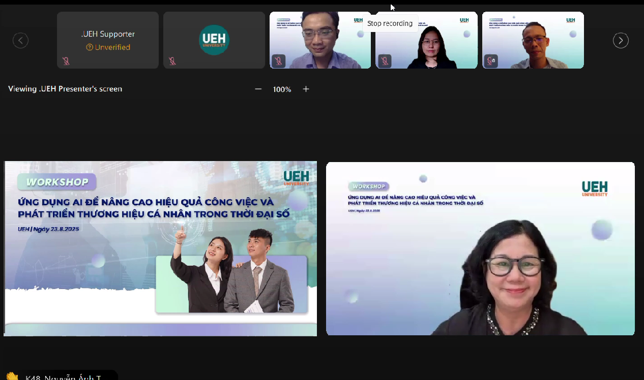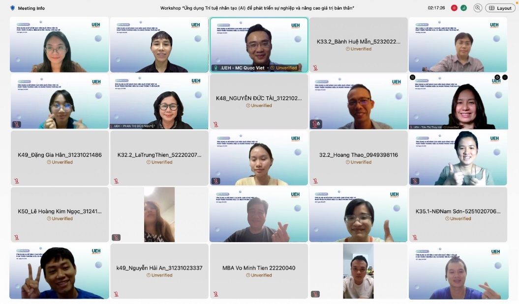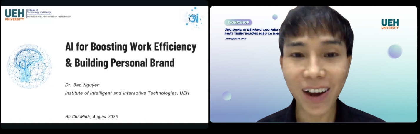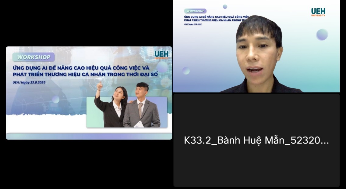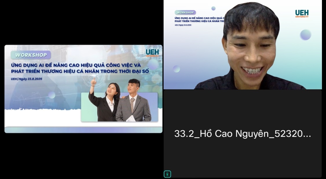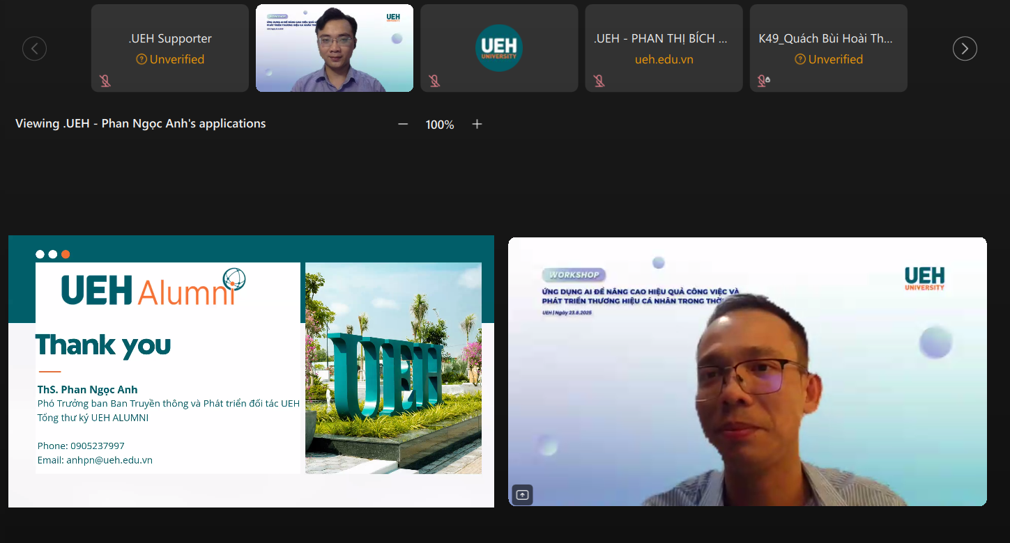Tối ngày 23/8/2025, workshop “Ứng dụng trí tuệ nhân tạo (AI) để nâng cao hiệu quả công việc và phát triển thương hiệu cá nhân trong thời đại số” do UEH Alumni phối hợp cùng Ban Chăm sóc Người học (DSA) tổ chức đã diễn ra trên nền tảng trực tuyến và thu hút sự tham gia đông đảo của các anh chị Tân Thạc sĩ, Tiến sĩ, Sinh viên và Cựu sinh viên UEH.