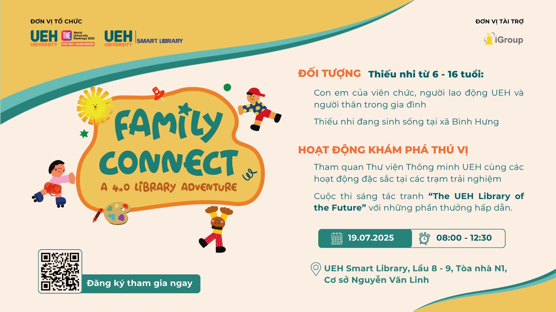 “Family Connect: A 4.0 Library Adventure” là hoạt động trải nghiệm và sáng tạo dành cho cho thiếu nhi từ 6-16 tuổi, nhằm kết nối các thành viên UEH Family, thắt chặt mối quan hệ hợp tác giữa UEH với chính quyền địa phương, lan tỏa văn hóa đọc, khơi dậy đam mê tri thức và giới thiệu môi trường học tập hiện đại đến cộng đồng. Hoạt động này góp phần xây dựng một cộng đồng học thuật năng động, nhân văn và bền vững trong thời đại số.
