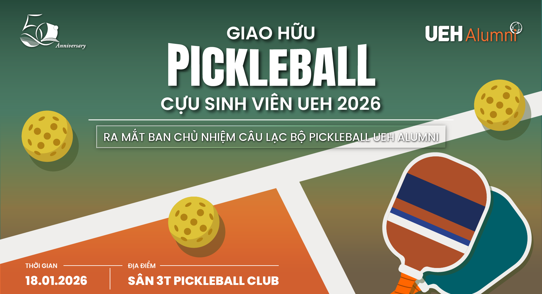 Nhân dịp chào mừng Tết Nguyên đán Bính Ngọ 2026, UEH Alumni tổ chức Giải giao lưu Pickleball “Ready for Homecoming 2026” - Thành lập câu lạc bộ và ra mắt Ban Chủ nhiệm câu lạc bộ Pickleball UEH Alumni nhằm tạo không khí giao lưu thể thao đầu xuân sôi nổi, lành mạnh và tăng cường kết nối cộng đồng cựu sinh viên UEH.