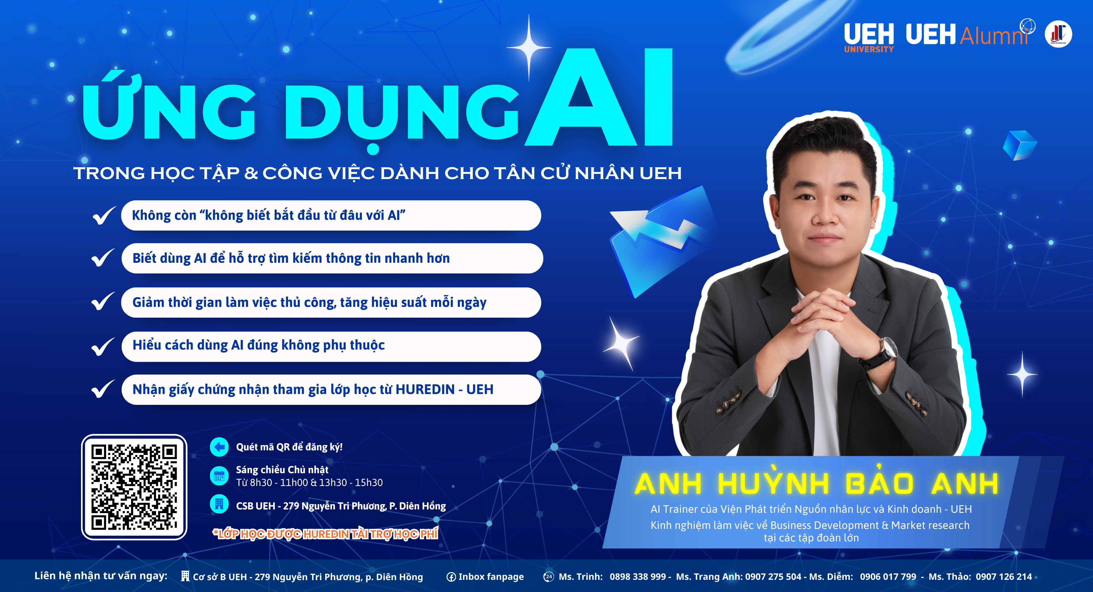 Với tinh thần đồng hành cùng người học trên hành trình phát triển suốt đời, kết nối tri thức và cùng nhau kiến tạo những giá trị bền vững cho cộng đồng. UEH Alumni phối hợp cùng Viện Phát triển Nguồn nhân lực và Kinh doanh UEH tổ chức lớp học: “Ứng dụng AI trong học tập & công việc dành cho tân cử nhân UEH”