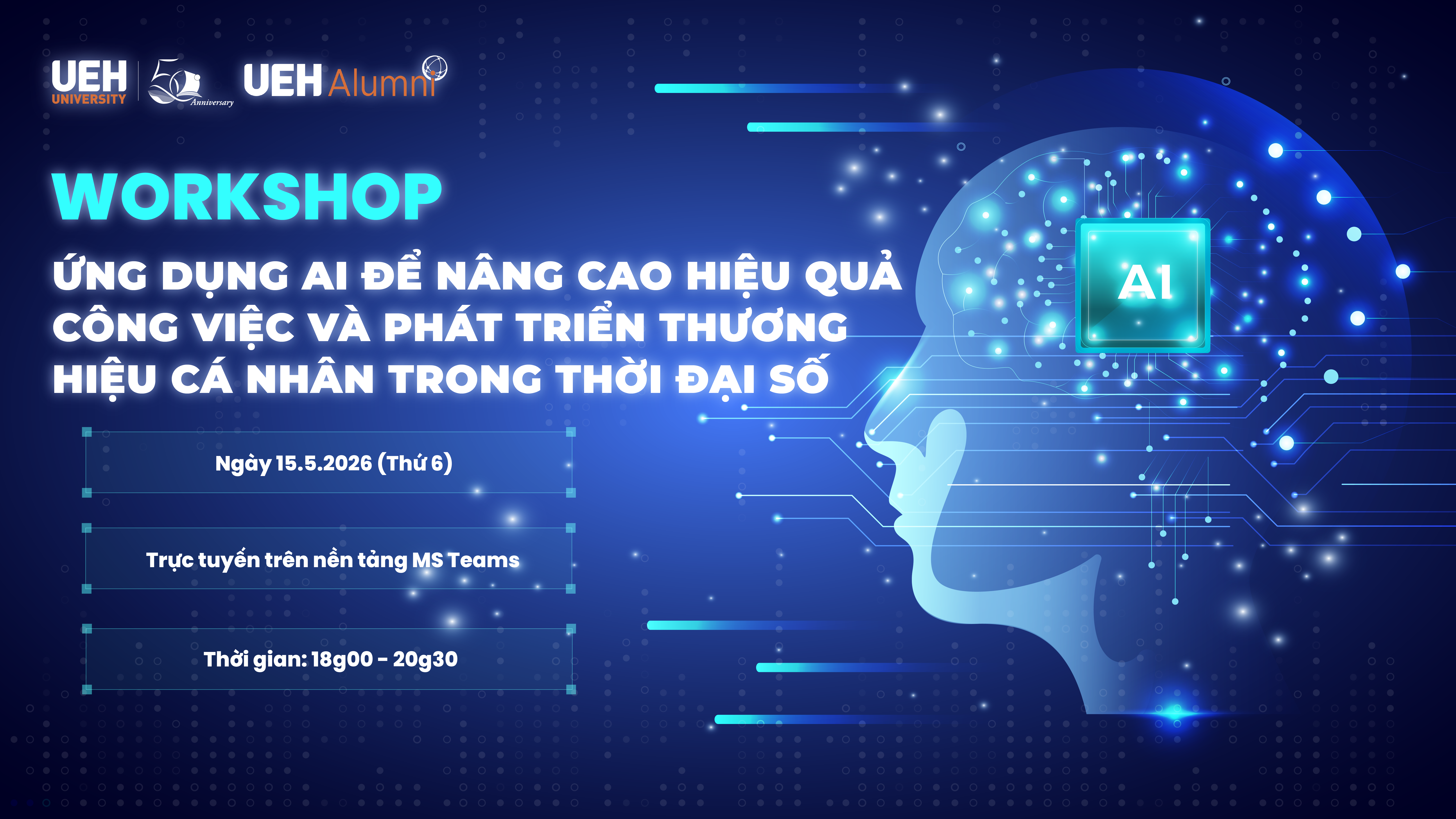 Đồng hành cùng cộng đồng UEH Alumni trong bối cảnh chuyển đổi số diễn ra mạnh mẽ trên mọi lĩnh vực, UEH Alumni tổ chức workshop “Ứng dụng Trí tuệ nhân tạo (AI) để nâng cao hiệu quả công việc và phát triển thương hiệu cá nhân trong thời đại số” dành cho toàn thể cựu học viên UEH.